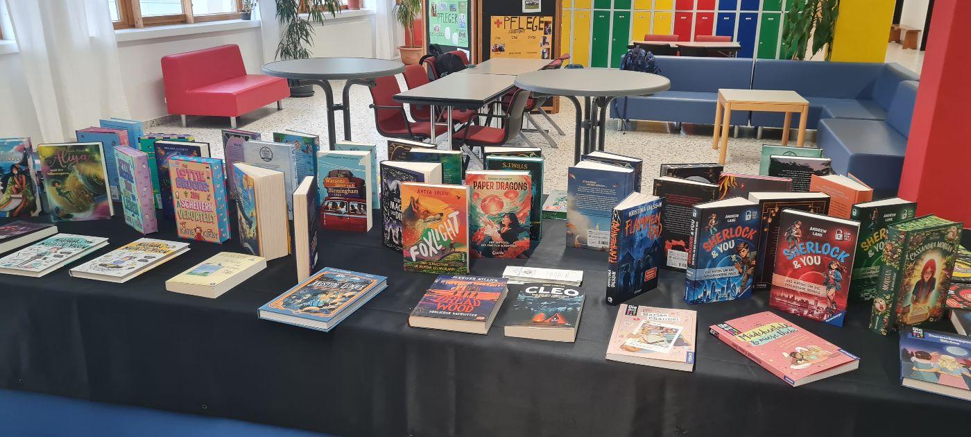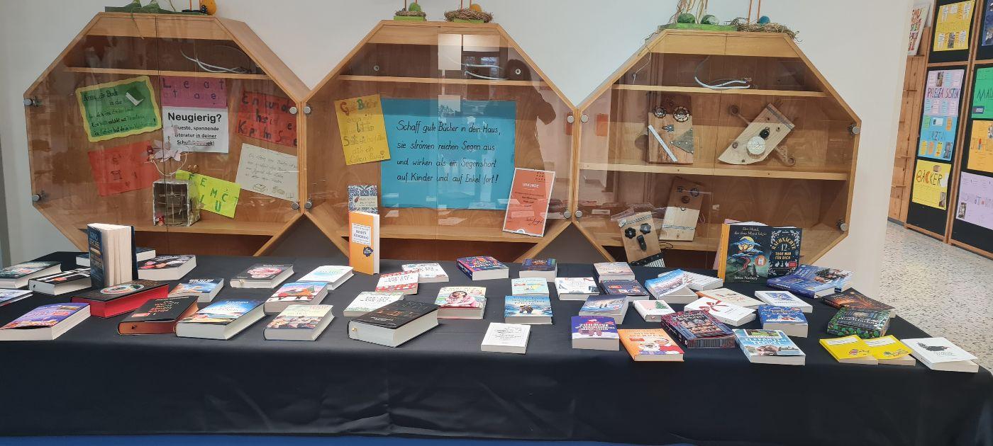 In den Wochen rund um den 1. Elternsprechtag findet in unserer Aula jedes Jahr eine vielfältige Bücherausstellung statt, die besonders während des Deutschunterrichts von unseren Schülerinnen und Schülern besucht wird. Die ausgestellten Bücher können – mit Einverständnis der Eltern – direkt über die Schule erworben werden.